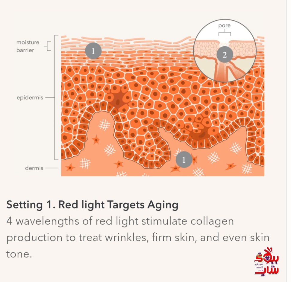 نور قرمز قادر است تا عمیق ترین لایه های پوست را تحریک به کلاژن سازی کند و چرخه پیری پوست را متوقف و دور آن را به طرف جوانی برگرداند.
