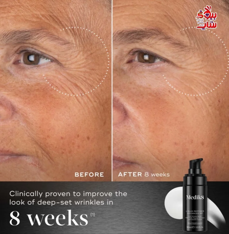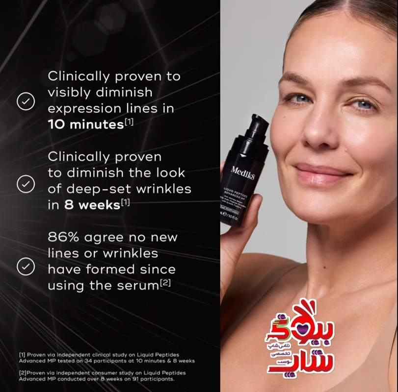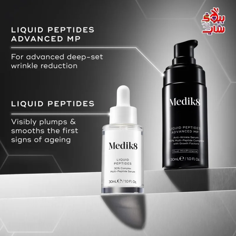 Making skin care simple, Medik8 takes the fuss out of caring for your complexion. Powered by three key ingredients: vitamin C. vitamin <t and non-negotiable SPF, the brand's signature skin care saviours are famed for their potent potions. Meet the Liquid Peptides Advanced MP (30mI), a hard- working serum that works to reduce the appearance of expression lines as well as deeper-set wrinkles.