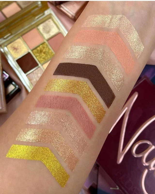 پلت GOLD هدی بیوتی یک پلت ۹رنگ بسیار زیبا با رنگهای شاین متالیک و مات است که از شدت رنگ زیاد ماندگاری بالا و پیگمنت فوقالعاده ای برخوردار است،این پلت با رنگهای زرد طلایی و اکلیل دار با تم رنگ صورتی های مات هارمونی رنگ بسیار زیبایی ایجاد می کند که بسیار مناسب فصل گرم و انواع آرایش های جذاب تابستونی می باشد،از این پلت برای هایلایتر صورت نیز می توانید استفاده کنید