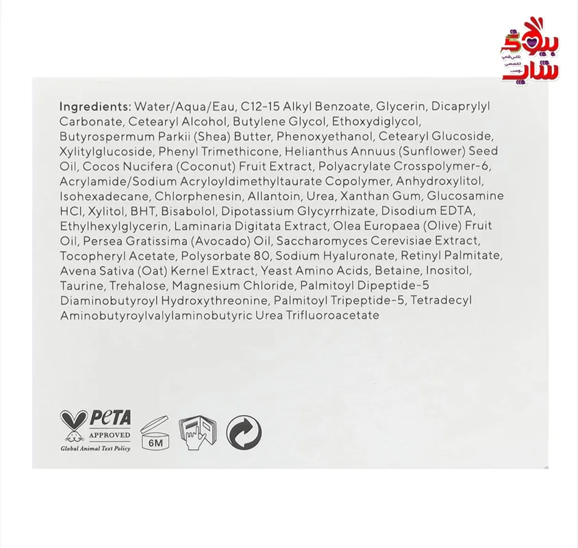 Xylitylglucoside, Phenyl Irimethicone Helianthus Annuus (Sunflower) Seed Oil, Cocos Nucifera (Coconut) Fruit Extract, Polyacrylate Crosspolymer-6, Acrylamide/Sodium Acryloyldimethyltaurate Copolymer, Anhydroxylitol, Isohexadecane, Chlorphenesin Allantoin, Urea, Xanthan Gum, Glucosamine HCI, Xylitol, BHT, Bisabolol, Dipotassium Glycyrrhizate, Disodium EDTA, Ethylhexylglycerin, Laminaria Digitata Extract, Olea Europaea (Olive) Fruit Oil, Persea Gratissima (Avocado) Oil, Saccharomyces Cerevisiae Extract, Tocopheryl Acetate Polysorbate 80, Sodium Hyaluronate, Retinyl Palmitate, Avena Sativa (Oat) Kernel Extract, Yeast Amino Acids, Betaine, Inositol, Taurine, Trehalose, Magnesium Chloride, Palmitoyl Dipeptide-5 Diaminobutyroy Hydroxythreonine, Palmitoyl Tripeptide-5, Tetradecyl Aminobutyroylvalylaminobutyric Urea Trifluoroacetate