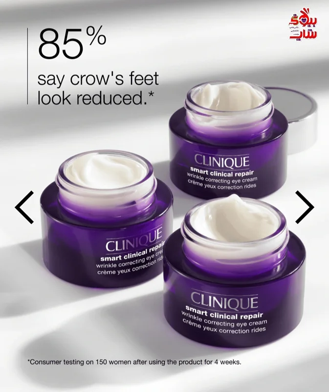 کرم ضد چروک قوی اسمارت کلینیکال ریپیر از برند کلینیک آمریکا یک کرم دور چشم بسیار قوی برای رفع چروک های اطراف چشم خصوصا چروکهای پنجه کلاغی ،خطوط عمیق اطراف چشم است.این محصول برای مبارزه با علائم پیری و چروکهای اطراف چشم طراحی شده است خطوط اطراف چشم ریز و عمیق را با هیدراته کردن فوری و طولانی مدت از بین میبرد وبا ایجاد کشش خوبی روی پوست چروکها کاملا محو میشوند و اطراف چشم شما با ظاهری بهتر آماده برای میکاپ و یا مهمانی ها میشود.،و از طرفی این یک تاثیر درمانی بروی چروک نیز میباشد زیرا اسيد هیالورونیک غلیظ ،پپتاید های موجود در این دور چشم وارد چرخه کلاژن سازی شده و با ترمیم چروکها تاثیر درمانی نیز دارد.این کرم یک اصلاح کننده چروک اطراف چشم قدرتمند است که میتوانید روز و شب و یا حتی به عنوان پرایمر زیر آرایش یا کانسیلر خود و یا ترکیب با کانسیلر برای محو خطوط استفاده نمایید.خستگی اطراف چشم.افتادگی پوست را اصلاح میکند پس به صورت ۳۶۰درجه دور چشم قابل استفاده است. تست آلرژی و حساسیت داردو مورد تأیید متخصصین چشم آمريکا نیز می باشد.